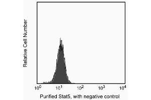 Stat (Signal transducer and activators of transcription) proteins are critical mediators of the biologic activity of cytokines, including interleukins, interferons, erythropoietin, and growth factors. Ligand-receptor interaction leads to activation of constitutively associated JAK family kinases and subsequent recruitment/activation of Stat proteins by tyrosine phosphorylation. Active Stat proteins then move to the nucleus to promote transcription of cytokine-inducible genes. Seven Stat proteins have been cloned, each of which is differentially expressed and/or activated in a cytokine-specific and cell type-specific manner. Stat5 has been characterized and shown to be encoded by two separate genes, Stat5a and Stat5b that share over 90% identity at the amino acid level. Stat5a has been shown to be involved in lactogenesis and mammary development, while Stat5b has been shown to be involved in growth hormone signaling and to play a role in liver gene expression. Both Stat5a and Stat5b share similarities, both are involved in IL-2 induced peripheral T cell proliferation. The peptide hormone, prolactin, binds to the prolactin receptor (PRLR) to initiate the lactogenic response. There are at least three forms of PRLR, however, only the long form is able to activate the 92-kDa Stat5 protein by inducing phosphorylation at Y694. Once phosphorylated, Stat5 becomes an essential transcription factor which binds to the beta-casein gene promoter. The presence of an SH2 domain within Stat5 suggests that it may directly interact with protein tyrosine kinases (PTKs) such as JAK2.