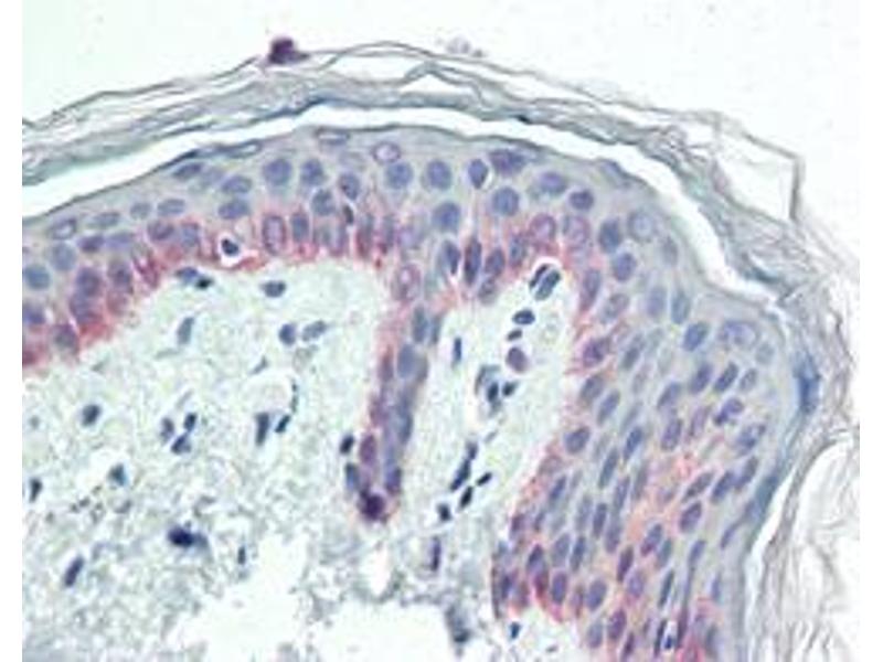 CK5 (keratin 5) is a member of the keratin gene family. Biochemically, most members of the CK family fall into one of two classes, type I (acidic polypeptides) and type II (basic polypeptides). The type II cytokeratins consist of basic or neutral proteins which are arranged in pairs of heterotypic keratin chains coexpressed during differentiation of simple and stratified epithelial tissues. This type II cytokeratin is specifically expressed in the basal layer of the epidermis with family member KRT14. The type II cytokeratins are clustered in a region of chromosome 12q12-q13. At least one member of the acidic family and one member of the basic family is expressed in all epithelial cells. Cytokeratin 5 is expressed in normal basal cells. Mutations of the Cytokeratin5 gene (KRT5) have been shown to result in the autosomal dominant disorderepidermolysis bullosa (EB). Defects in KRT5 are a cause of epidermolysis bullosa simplex.