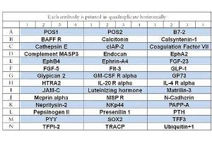 - Antibodies against a variety of different antigens (up to 40 biomarkers per slide) are printed onto the glass slide. Replicates are included, saving you both time and precious sample volume.