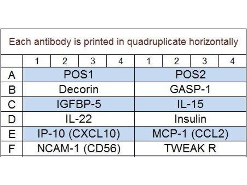 - Decorin, GASP-1 (WFIKKNRP), IGFBP-5, IL-15, IL-22, Insulin, IP-10 (CXCL10), MCP-1(CCL2), NCAM-1 (CD56), TWEAK R (TNFRSF12)