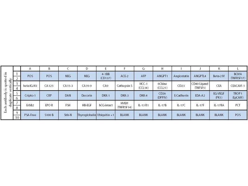 - 4-1BB (TNFRSF9/CD137), ACE-2, Alpha-fetoprotein, Angiopoietin-1, Angiostatin, ANGPTL4, Beta-2 Microglobulin, BCMA (TNFRSF17), beta IG-H3, CA125, CA15-3, CA19-9, CA9, Cathepsin S, HCC-1 (CCL14), 6Ckine (CCL21), CD23, CD40 Ligand (TNFSF5), CEA, CEACAM-1, Cripto-1, CRP (C-Reactive Protein), DAN, Decorin, DKK-1, Dkk-3, Dkk-4, CD26 (DPPIV), E-Cadherin, EDA-A2, EG-VEGF (PK1), TROP1 (EpCAM), ErbB2, Erythropoietin R, FSH, HB-EGF, hCG intact, HVEM (TNFRSF14), IL-13 R1, IL-17B, IL-17C, IL-17F, IL-17 RA, Procalcitonin, PSA-free, S100 B, Sonic Hedgehog N-Terminal (Shh-N), Thyroglobulin, Ubiquitin+1