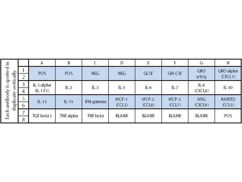 1. Place each membrane into the provided eight-well tray (- means the antibody printed side). 2. Add 2 ml 1X Blocking Buffer and incubate at room temperature for 30 min to block membranes. Note: incubation may be done at 4 °C for overnight. 3. Incubate membranes with 1ml of sample at room temperature for 1 to 2 hours. Dilute sample using 1X Blocking Buffer if necessary. Note: We recommend using 1 ml of Conditioned media or 1 ml of original or 10-fold diluted sera or plasma or 50-500 µg of protein for cell lysates and tissue lysates. Dilute the lysate at least 10 folds with 1 X blocking buffer. Note: The amount of sample used depends on the abundance of cytokines. More of the sample can be used if the signals are too weak. If the signals are too strong, the sample can be diluted further. Note: Incubation may be done at 4 °C for overnight. 4. Decant the samples from each container, and wash 3 times with 2 ml of 1X Wash Buffer I at room temperature with shaking. Please allow 5 min per wash. Dilute 20X Wash Buffer I with H 2 O. 5. Wash 2 times with 2 ml of 1X Wash Buffer II at room temperature with shaking. Allow 5 min per wash. Dilute 20X Wash Buffer II with H 2 O. 6. Prepare working solution for primary antibody. Add 100µl of 1X blocking buffer to the Biotin-Conjugated Anti- Cytokines tube. Mix gently and transfer all mixture to a tube containing 2 ml of 1X blocking buffer. Note: the diluted biotin-conjugated antibodies can be stored at 4 °C for 2-3 days. 7. Add 1 ml of diluted biotin-conjugated antibodies to each membrane. Incubate at room temperature for 1-2 hours. Note: incubation may be done at 4 °C for overnight. 8. Wash as directed in steps 4 and 5. 9. Add 2 ml of 1,000 fold diluted HRP-conjugated streptavidin (e.g. add 2 µl of HRP-conjugated streptavidin to 1998 µl 1X Blocking Buffer) to each membrane. Note: Mix the tube containing 1,000X HRP-Conjugated Streptavidin well before use since precipitation may form during storage. 10. Incubate at room temperature for 2 hours. Note: incubation may be done at 4 °C for overnight. 11. Wash as directed in steps 4 and 5.