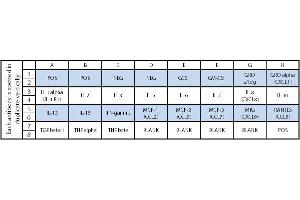 - GCSF, GM-CSF, GRO alpha/beta/gamma, GRO alpha (CXCL1), IL-1 alpha (IL-1 F1), IL-2, IL-3, IL-5, IL-6, IL-7, IL-8 (CXCL8), IL-10, IL-13, IL-15, IFN-gamma, MCP-1 (CCL2), MCP-2 (CCL8), MCP-3 (MARC/CCL7), MIG (CXCL9), RANTES (CCL5), TGF beta 1, TNF alpha, TNF beta (TNFSF1B)