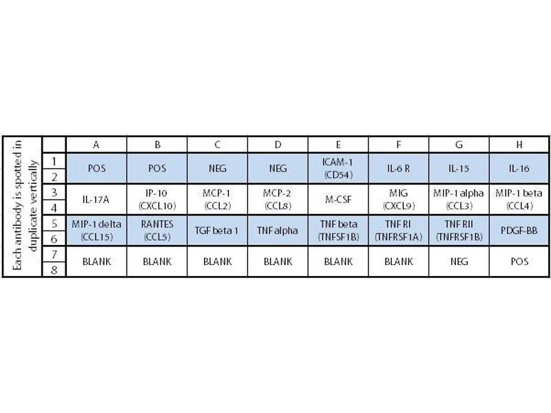 - ICAM-1 (CD54), IL-6 R, IL-15, IL-16, IL-17A, IP-10 (CXCL10), MCP-1 (CCL2), MCP-2 (CCL8), M-CSF, MIG (CXCL9), MIP-1 alpha (CCL3), MIP-1 beta (CCL4), MIP-1 delta (CCL15), RANTES (CCL5), TGF beta 1, TNF alpha, TNF beta (TNFSF1B), TNF RI (TNFRSF1A), TNF RII (TNFRSF1B), PDGF-BB