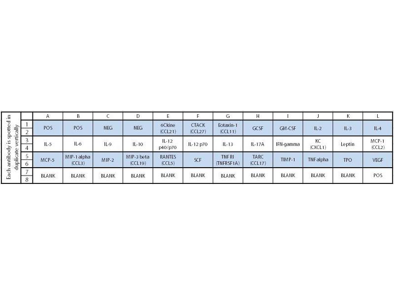 - 6Ckine (CCL21), CTACK (CCL27), Eotaxin-1 (CCL11), GCSF, GM-CSF, IL-2, IL-3, IL-4, IL-5, IL-6, IL-9, IL-10, IL-12 p40/p70, IL-12 p70, IL-13, IL-17A, IFN-gamma, KC (CXCL1), Leptin, MCP-1 (CCL2), MCP-5, MIP-1 alpha (CCL3), MIP-2, MIP-3 beta (CCL19), RANTES (CCL5), SCF, TNF RI (TNFRSF1A), TARC (CCL17), TIMP-1, TNF alpha, Thrombopoietin (TPO), VEGF-A