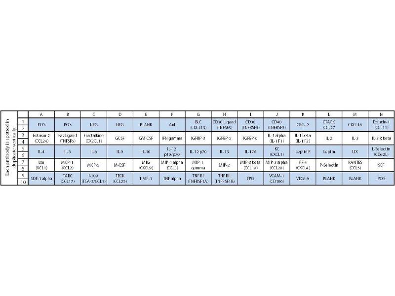 - Axl, BLC (CXCL13), CD30 Ligand (TNFSF8), CD30 (TNFRSF8), CD40 (TNFRSF5), CRG-2, CTACK (CCL27), CXCL16, Eotaxin-1 (CCL11), Eotaxin-2 (MPIF-2/CCL24), Fas Ligand (TNFSF6), Fractalkine (CX3CL1), GCSF, GM-CSF, IFN-gamma, IGFBP-3, IGFBP-5, IGFBP-6, IL-1 beta (IL-1 F2), IL-10, IL-12 p40/p70, IL-12 p70, IL-13, IL-17A, IL-1 alpha (IL-1 F1), IL-2, IL-3, IL-3 R beta, IL-4, IL-5, IL-6, IL-9, KC (CXCL1), Leptin, Leptin R, LIX, L-Selectin (CD62L), Lymphotactin (XCL1), MCP-1 (CCL2), MCP-5, M-CSF, MIG (CXCL9), MIP-1 alpha (CCL3), MIP-1 gamma, MIP-2, MIP-3 beta (CCL19), MIP-3 alpha (CCL20), Platelet Factor 4 (CXCL4), P-Selectin, RANTES (CCL5), SCF, SDF-1 alpha (CXCL12 alpha), TNF RI (TNFRSF1A), TNF RII (TNFRSF1B), TARC (CCL17), I-309 (TCA-3/CCL1), TECK (CCL25), TIMP-1, TNF alpha, Thrombopoietin (TPO), VCAM-1 (CD106), VEGF-A