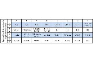 - CINC-2, CINC-3, CNTF, Fractalkine (CX3CL1), GM-CSF, IFN-gamma, IL-1 alpha (IL-1 F1), IL-1 beta (IL-1 F2), IL-4, IL-6, IL-10, LIX, Leptin, MCP-1 (CCL2), MIP-3 alpha (CCL20), beta-NGF, TIMP-1, TNF alpha, VEGF-A