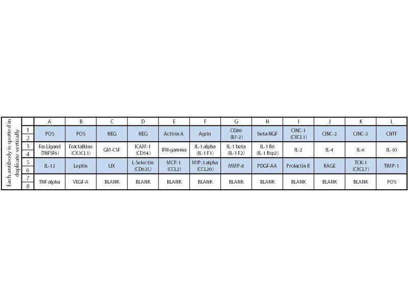 - Activin A, Agrin, CD86 (B7-2), beta-NGF, CINC-1 (CXCL1), CINC-2, CINC-3, CNTF, Fas Ligand (TNFSF6), Fractalkine (CX3CL1), GM-CSF, ICAM-1 (CD54), IFN-gamma, IL-1 alpha (IL-1 F1), IL-1 beta (IL-1 F2), IL-1 R6 (IL-1 Rrp2), IL-2, IL-4, IL-6, IL-10, IL-13, Leptin, LIX, L-Selectin (CD62L), MCP-1 (CCL2), MIP-3 alpha (CCL20), MMP-8, PDGF-AA, Prolactin R, RAGE, TCK-1 (CXCL7), TIMP-1, TNF alpha, VEGF-A