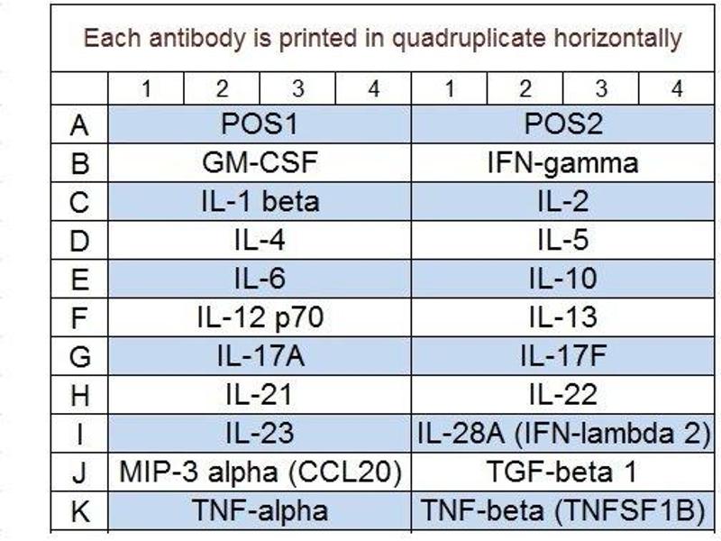 - GM-CSF, IFN-gamma, IL-1 beta (IL-1 F2), IL-10, IL-12 p70, IL-13, IL-17A, IL-17F, IL-2, IL-21, IL-22, IL-23, IL-28A (IFN-lambda 2), IL-4, IL-5, IL-6, MIP-3 alpha (CCL20), TGF beta 1, TNF alpha, TNF beta (TNFSF1B)