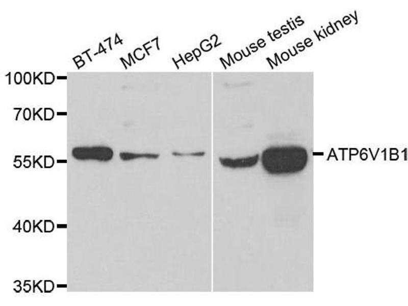 This gene encodes a component of vacuolar ATPase (V-ATPase), a multisubunit enzyme that mediates acidification of eukaryotic intracellular organelles. V-ATPase dependent organelle acidification is necessary for such intracellular processes as protein sorting, zymogen activation, receptor-mediated endocytosis, and synaptic vesicle proton gradient generation. V-ATPase is composed of a cytosolic V1 domain and a transmembrane V0 domain. The V1 domain consists of three A and three B subunits, two G subunits plus the C, D, E, F, and H subunits. The V1 domain contains the ATP catalytic site. The V0 domain consists of five different subunits: a, c, c', c'', and d. Additional isoforms of many of the V1 and V0 subunit proteins are encoded by multiple genes or alternatively spliced transcript variants. This encoded protein is one of two V1 domain B subunit isoforms and is found in the kidney. Mutations in this gene cause distal renal tubular acidosis associated with sensorineural deafness. [provided by RefSeq, Jul 2008].