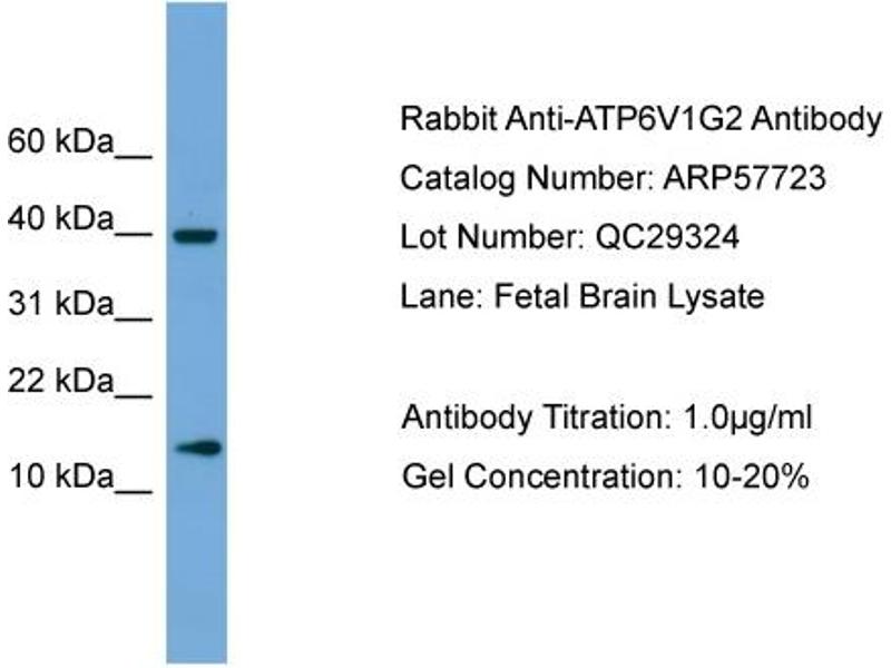 This gene encodes a component of vacuolar ATPase (V-ATPase), a multisubunit enzyme that mediates acidification of intracellular compartments of eukaryotic cells. V-ATPase dependent acidification is necessary for such intracellular processes as protein sorting, zymogen activation, receptor-mediated endocytosis, and synaptic vesicle proton gradient generation. V-ATPase is composed of a cytosolic V1 domain and a transmembrane V0 domain. The V1 domain consists of three A and three B subunits, two G subunits plus the C, D, E, F, and H subunits. The V1 domain contains the ATP catalytic site. The V0 domain consists of five different subunits: a, c, c', c'', and d. Additional isoforms of many of the V1 and V0 subunit proteins are encoded by multiple genes or alternatively spliced transcript variants. This encoded protein is one of three V1 domain G subunit proteins. This gene had previous gene symbols of ATP6G and ATP6G2. Alternatively spliced transcript variants encoding different isoforms have been described. Read-through transcription also exists between this gene and the downstream DEAD (Asp-Glu-Ala-Asp) box polypeptide 39B (DDX39B) gene. [provided by RefSeq, Feb 2011].