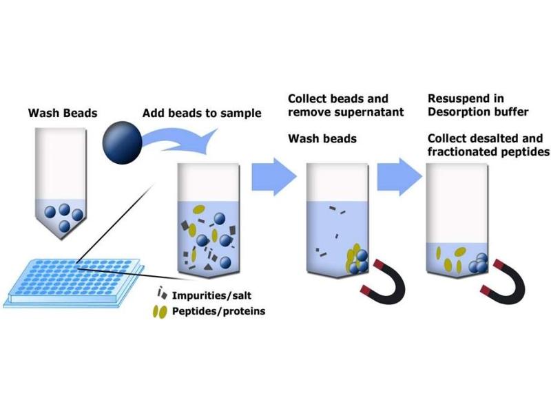 - Peptides and proteins bind to cationic groups on the surface of MagSi-WCX, while impurities are washed away. After elution in Desorption buffer, purified peptides and proteins are ready for downstream use.