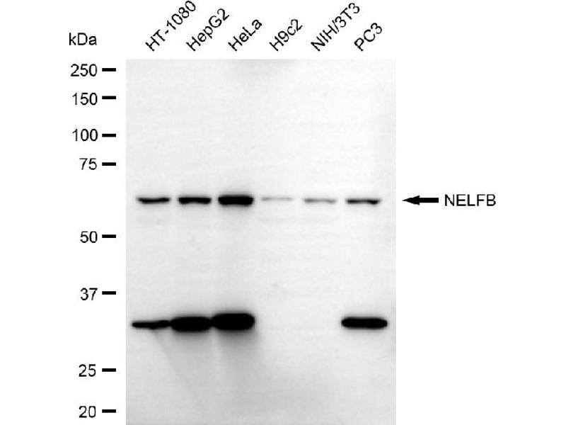 NELFB is a subunit of negative elongation factor (NELF), which also includes NELFA (WHSC2\; MIM 606026), either NELFC or NELFD (TH1L\; MIM 605297), and NELFE (RDBP\; MIM 154040). NELF acts with DRB sensitivity-inducing factor (DSIF), a heterodimer of SPT4 (SUPT4H1\; MIM 603555) and SPT5 (SUPT5H\; MIM 602102), to cause transcriptional pausing of RNA polymerase II (see MIM 180660) (Narita et al., 2003 [PubMed 12612062]).[supplied by OMIM, Mar 2008].