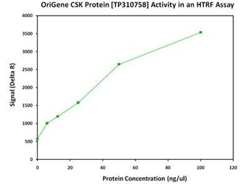 Non-receptor tyrosine-protein kinase that plays an important role in the regulation of cell growth, differentiation, migration and immune response. Phosphorylates tyrosine residues located in the C-terminal tails of Src-family kinases (SFKs) including LCK, SRC, HCK, FYN, LYN or YES1. Upon tail phosphorylation, Src-family members engage in intramolecular interactions between the phosphotyrosine tail and the SH2 domain that result in an inactive conformation. To inhibit SFKs, CSK is recruited to the plasma membrane via binding to transmembrane proteins or adapter proteins located near the plasma membrane. Suppresses signaling by various surface receptors, including T- cell receptor (TCR) and B-cell receptor (BCR) by phosphorylating and maintaining inactive several positive effectors such as FYN or LCK (By similarity).