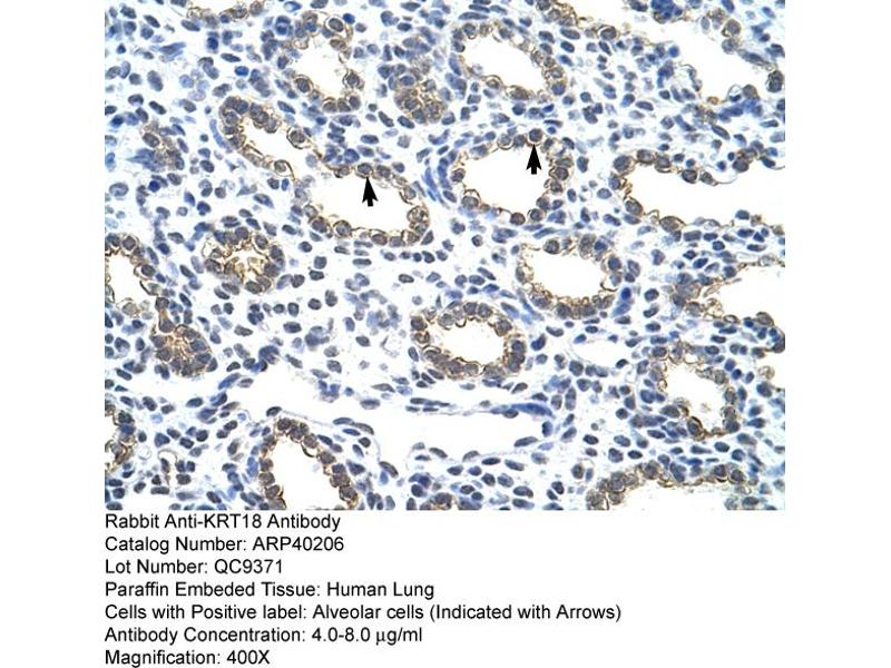 KRT18 encodes the type I intermediate filament chain keratin 18. Keratin 18, together with its filament partner keratin 8, are perhaps the most commonly found members of the intermediate filament gene family. They are expressed in single layer epithelial tissues of the body. Mutations in this gene have been linked to cryptogenic cirrhosis. Two transcript variants encoding the same protein have been found for this gene. [provided by RefSeq, Jul 2008].