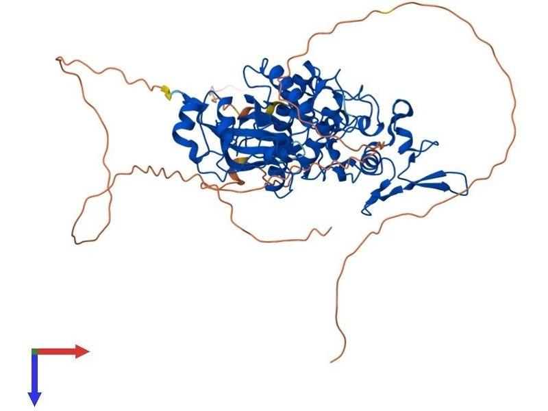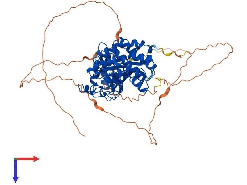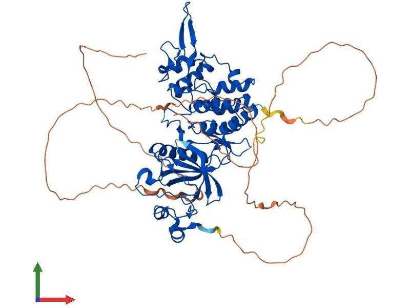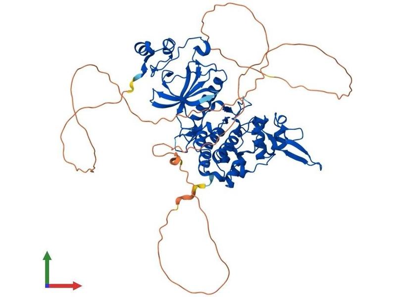 DYRK2 belongs to a family of protein kinases whose members are presumed to be involved in cellular growth and/or development. The family is defined by structural similarity of their kinase domains and their capability to autophosphorylate on tyrosine residues. DYRK2 has demonstrated tyrosine autophosphorylation and catalyzed phosphorylation of histones H3 and H2B in vitro. Two isoforms of DYRK2 have been isolated. The predominant isoform, isoform 1, lacks a 5' terminal insert. [provided by RefSeq, Jul 2008].