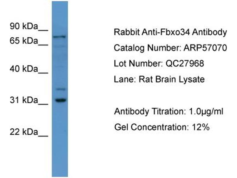 Members of the F-box protein family, such as FBXO34, are characterized by an approximately 40-amino acid F-box motif. SCF complexes, formed by SKP1 (MIM 601434), cullin (see CUL1\; MIM 603134), and F-box proteins, act as protein-ubiquitin ligases. F-box proteins interact with SKP1 through the F box, and they interact with ubiquitination targets through other protein interaction domains (Jin et al., 2004 [PubMed 15520277]).[supplied by OMIM, Mar 2008].