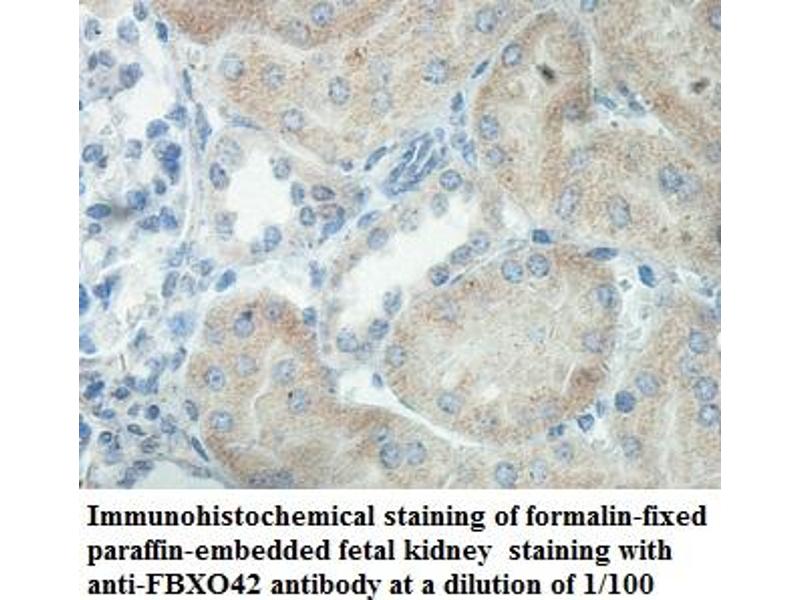 Members of the F-box protein family, such as FBXO42, are characterized by an approximately 40-amino acid F-box motif. SCF complexes, formed by SKP1 (SKP1A\; MIM 601434), cullin (see CUL1\; MIM 603134), and F-box proteins, act as protein-ubiquitin ligases. F-box proteins interact with SKP1 through the F box, and they interact with ubiquitination targets through other protein interaction domains (Jin et al., 2004 [PubMed 15520277]).[supplied by OMIM, Dec 2010].
