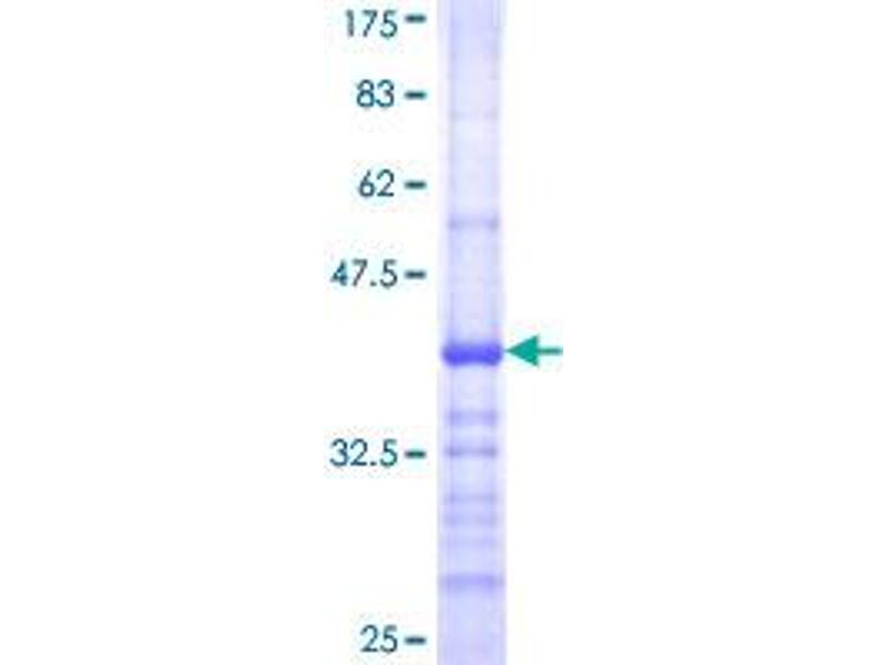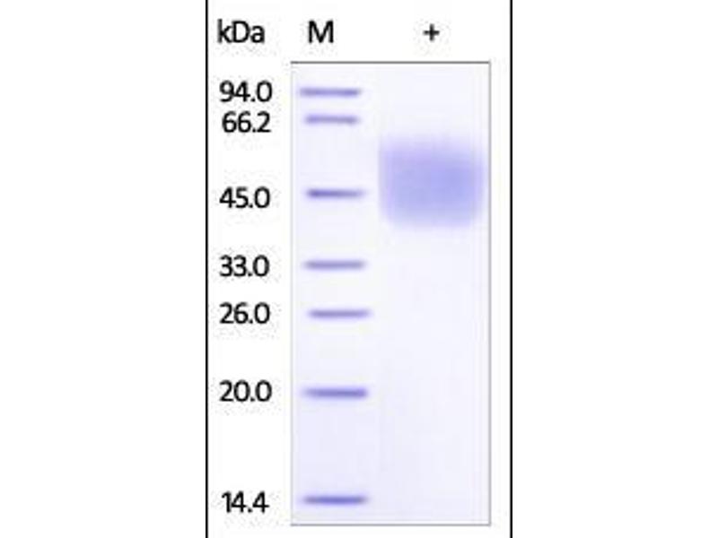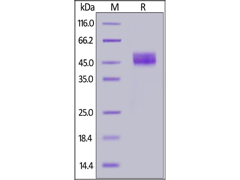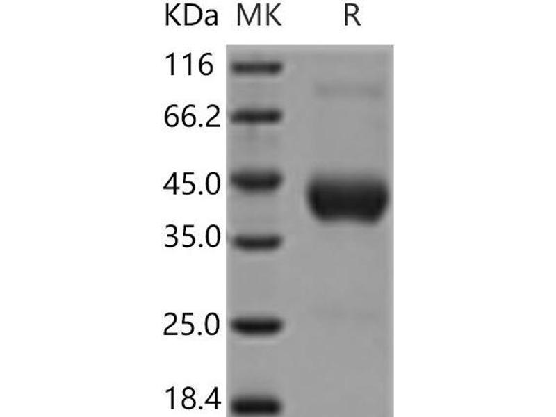 The purity of the protein is greater than 90 % as determined by SDS-PAGE and Coomassie blue staining.