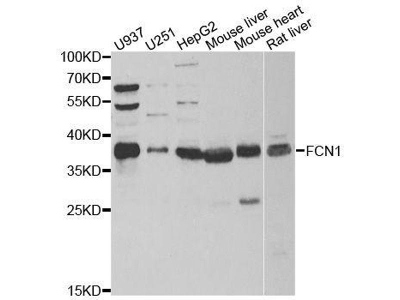 The ficolin family of proteins are characterized by the presence of a leader peptide, a short N-terminal segment, followed by a collagen-like region, and a C-terminal fibrinogen-like domain. The collagen-like and the fibrinogen-like domains are also found separately in other proteins such as complement protein C1q, C-type lectins known as collectins, and tenascins. However, all these proteins recognize different targets, and are functionally distinct. Ficolin 1 encoded by FCN1 is predominantly expressed in the peripheral blood leukocytes, and has been postulated to function as a plasma protein with elastin-binding activity. [provided by RefSeq, Jul 2008].