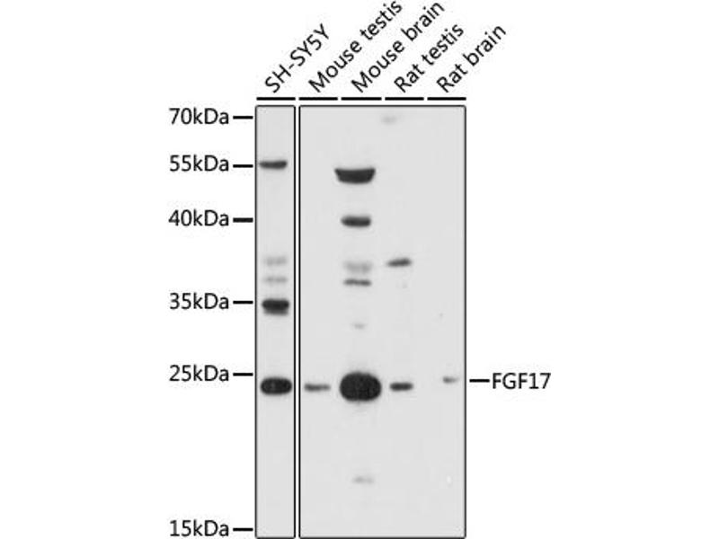 The protein encoded by this gene is a member of the fibroblast growth factor (FGF) family. FGF family members possess broad mitogenic and cell survival activities, and are involved in a variety of biological processes including embryonic development cell growth, morphogenesis, tissue repair, tumor growth and invasion. This gene was shown to be prominently expressed in the cerebellum and cortex. The mouse homolog of this gene was localized to specific sites in the midline structures of the forebrain, the midbrain-hindbrain junction, developing skeleton and developing arteries, which suggests a role in central nervous system, bone and vascular development. This gene was referred to as FGF-13 in reference 2, however, its amino acid sequence and chromosomal localization are identical to FGF17. [provided by RefSeq, Jul 2008].