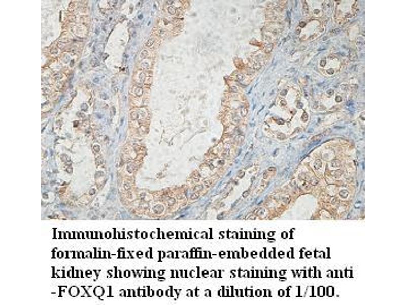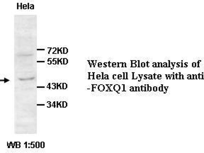 FOXQ1 is a member of the FOX gene family, which is characterized by a conserved 110-amino acid DNA-binding motif called the forkhead or winged helix domain. FOX genes are involved in embryonic development, cell cycle regulation, tissue-specific gene expression, cell signaling, and tumorigenesis (Bieller et al., 2001 [PubMed 11747606]).[supplied by OMIM, May 2009].