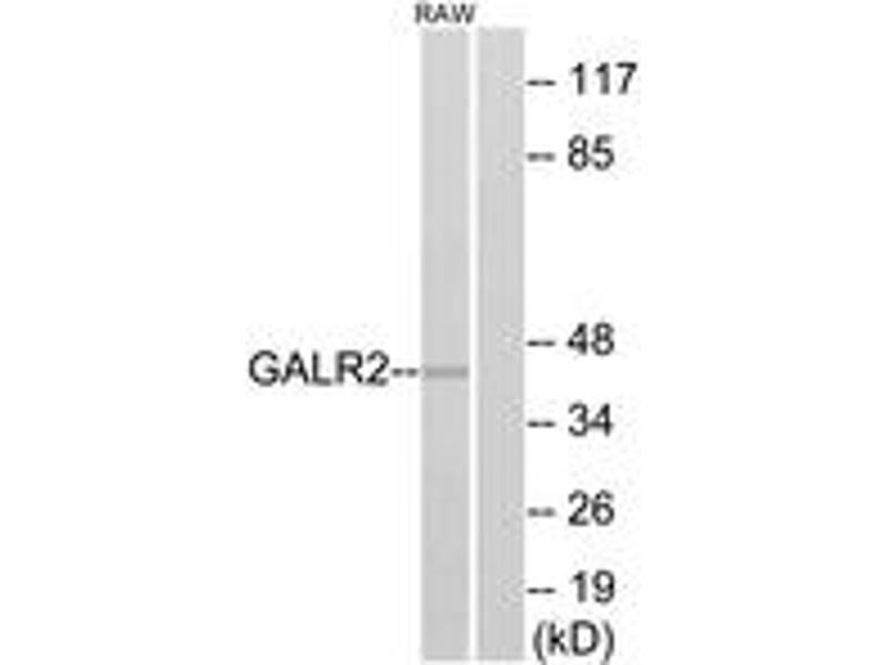Galanin is an important neuromodulator present in the brain, gastrointestinal system, and hypothalamopituitary axis. It is a 30-amino acid non-C-terminally amidated peptide that potently stimulates growth hormone secretion, inhibits cardiac vagal slowing of heart rate, abolishes sinus arrhythmia, and inhibits postprandial gastrointestinal motility. The actions of galanin are mediated through interaction with specific membrane receptors that are members of the 7-transmembrane family of G protein-coupled receptors. GALR2 interacts with the N-terminal residues of the galanin peptide. The primary signaling mechanism for GALR2 is through the phospholipase C/protein kinase C pathway (via Gq), in contrast to GALR1, which communicates its intracellular signal by inhibition of adenylyl cyclase through Gi. However, it has been demonstrated that GALR2 couples efficiently to both the Gq and Gi proteins to simultaneously activate 2 independent signal transduction pathways. [provided by RefSeq, Jul 2008].