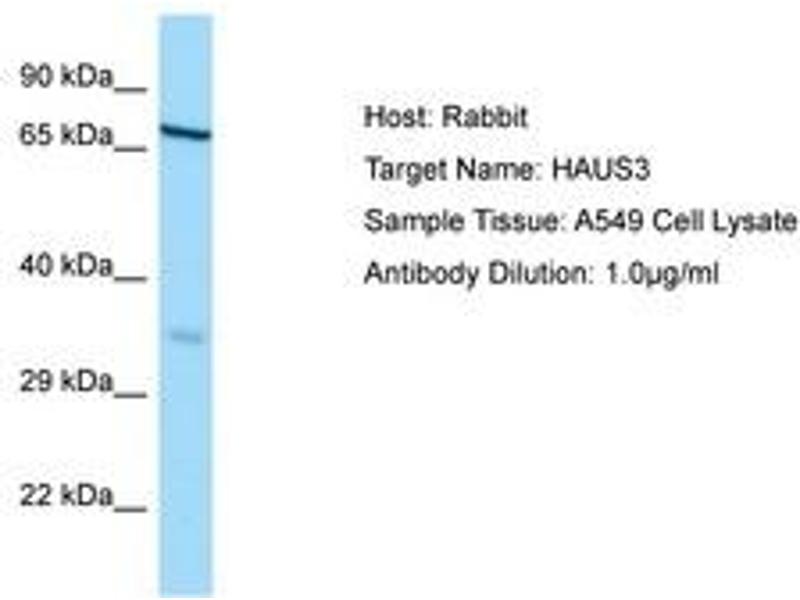 HAUS3 is 1 of 8 subunits of the 390-kD human augmin complex, or HAUS complex. The augmin complex was first identified in Drosophila, and its name comes from the Latin verb 'augmentare,' meaning 'to increase.' The augmin complex is a microtubule-binding complex involved in microtubule generation within the mitotic spindle and is vital to mitotic spindle assembly (Goshima et al., 2008 [PubMed 18443220]\; Uehara et al., 2009 [PubMed 19369198]).[supplied by OMIM, Nov 2010].