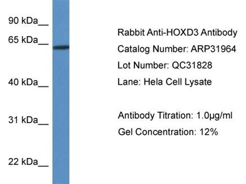This gene belongs to the homeobox family of genes. The homeobox genes encode a highly conserved family of transcription factors that play an important role in morphogenesis in all multicellular organisms. Mammals possess four similar homeobox gene clusters, HOXA, HOXB, HOXC and HOXD, located on different chromosomes, consisting of 9 to 11 genes arranged in tandem. This gene is one of several homeobox HOXD genes located at 2q31-2q37 chromosome regions. Deletions that removed the entire HOXD gene cluster or 5' end of this cluster have been associated with severe limb and genital abnormalities. The protein encoded by this gene may play a role in the regulation of cell adhesion processes. [provided by RefSeq, Jul 2008].