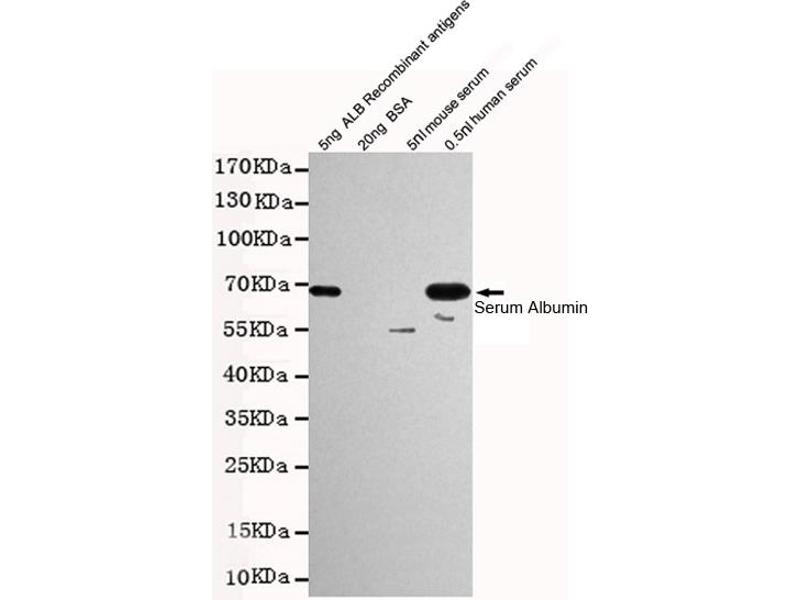 Albumin is a soluble, monomeric protein which comprises about one-half of the blood serum protein. Albumin functions primarily as a carrier protein for steroids, fatty acids, and thyroid hormones and plays a role in stabilizing extracellular fluid volume. Albumin is a globular unglycosylated serum protein of molecular weight 65,000. Albumin is synthesized in the liver as preproalbumin which has an N-terminal peptide that is removed before the nascent protein is released from the rough endoplasmic reticulum. The product, proalbumin, is in turn cleaved in the Golgi vesicles to produce the secreted albumin. [provided by RefSeq, Jul 2008].