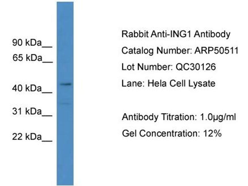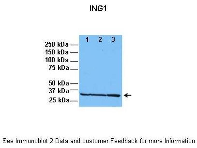 : "A panel of CAb antibodies recognize endogenous and ectopically expressed ING1 protein." in: Hybridoma, Vol. 19, Issue 2, pp. 161-5, (2000) (PubMed).