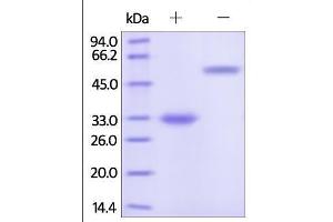 - This protein carries no "tag". The protein has a calculated MW of 25.8 kDa. As a result of glycosylation, the protein migrates as 33-35 kDa under reducing (R) condition, and 50-55 kDa under non-reducing (NR) condition (SDS-PAGE).