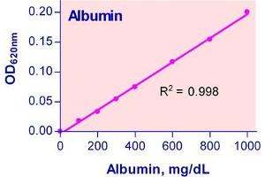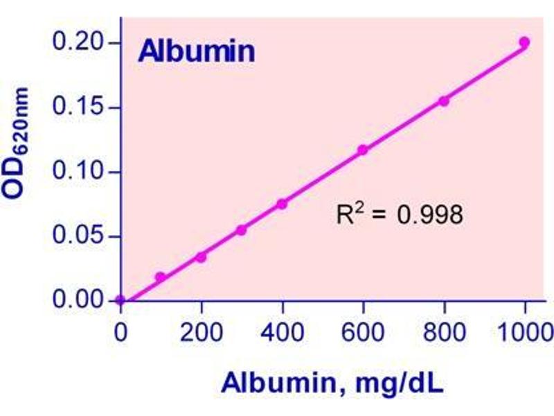 Sensitive and accurate. Use as little as 5 µL samples. Detection range 0.01 g/dL (1.5µM) to 5 g/dL (750µM) albumin in 96-well plate assay.