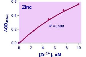 Sensitive and accurate. Uses 50 µL samples. Linear detection range 0.12 µM (0.78 µg/dL) to 10 µM (65 µg/dL) zinc in 96-well assay format.