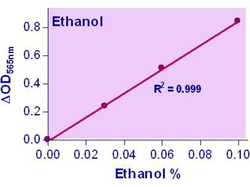 Alcoholic drinks are among the daily consumed beverages. Studies have shown heavy alcohol consumption may lead to various forms of liver diseases and to increased mortality rates. Quantitative determination of alcohol (ethanol, C2H5OH) has applications in basic research, drug discovery, clinic studies and in the alcoholic industry. Simple, direct and automation-ready procedures for measuring ethanol concentration are very desirable. This ethanol assay kit is based on alcohol dehydrogenase catalyzed oxidation of ethanol, in which the formed NADH is coupled to the formazan (MTT) chromogen. The intensity of the product color, measured at 565 nm, is proportionate to the ethanol concentration in the sample.