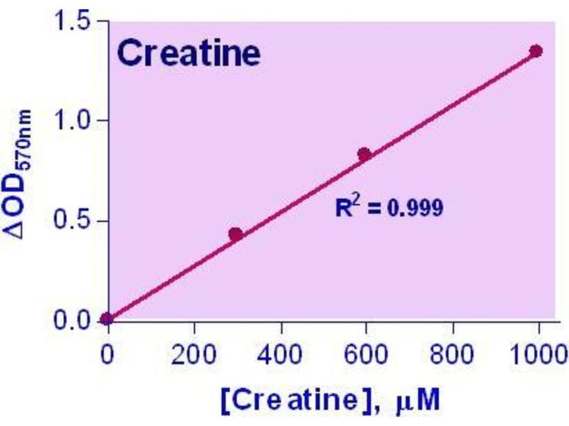 Creatine is present in vertebrates and helps to supply energy to muscle. In humans and animals, approximately half of creatine originates from food (mainly from fresh meat). Creatine supplementation has been investigated as a possible therapeutic approach for the treatment of muscular, neuromuscular, neurological and neurodegenerative diseases. Simple, direct and automation-ready procedures for measuring creatine are popular in research and drug discovery. This creatine assay is based on enzymatic reactions leading to formation of a pink colored product. The optical density at 570 nm or fluorescence intensity at gamma em/ex = 590/530 nm is directly proportional to the creatine concentration in the sample.