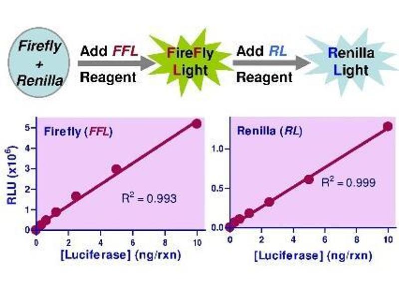 The accuracy of reporter assays can be improved by utilizing a dual reporter system. One of the reporter genes is correlated with the promoter of interest and is used to assess the effects of specific experimental conditions, while the second reporter is used as a control and serves as a baseline response. The Dual-Luciferase Reporter Gene Assay allows for the sequential measurement of the activity of two different luciferases, firefly (FFL) and Renilla (RL), in a single sample. The firefly luciferase luminescence is measured first by addition of the FFL Reagent. Next, the RL Reagent is added to the same well. The RL Reagent simultaneously quenches the firefly luciferase luminescence and initiates the Renilla luciferase reaction. The light production of both reactions can be conveniently measured on a luminometer. This bioluminescent dual reporter gene assay is extremely sensitive and is especially suitable for quantifying dual luciferase expression in recombinant cells or in cell free transcription/translation reactions. Assays can be performed in tubes, cuvettes or multi-well plates.