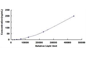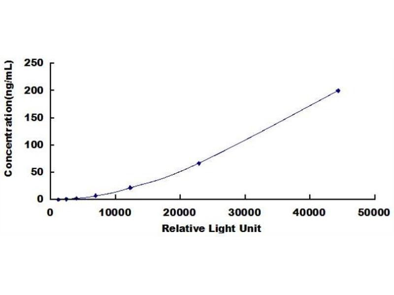In order to make the calculation easier, we plot the RLU value of the standard (X-axis) against the known concentration of the standard (Y-axis), although concentration is indeed the independent variable while RLU value is the dependent variable. Further, in this part, in order to help the customer perform the assay more visual, we provide the customer with the raw data (not the log of data). However, plotting log of the data to construct the curve will be recommended. The RLU values of the standard curve may vary according to the conditions of assay performance (e.g. operator, pipetting technique, washing technique or temperature effects). This curve is provided for demonstration only. The customers should establish their own standard curve for each test conducted. -