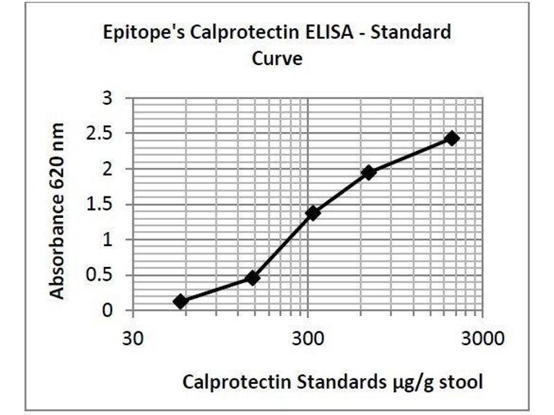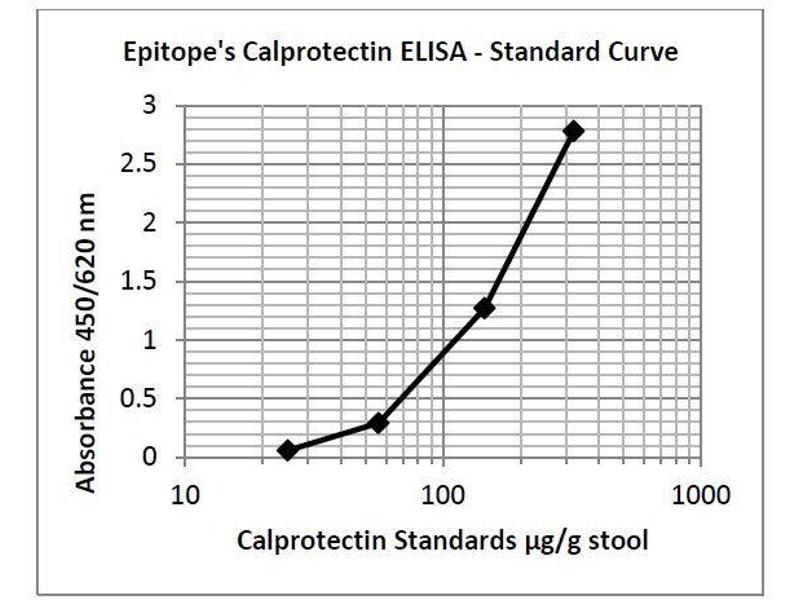 - This ELISA is designed, developed and produced for the quantitative measurement of human calprotectin in stool samples. The assay utilizes the two-site sandwich technique with two selected antibodies that bind to different epitopes of human calprotectin. Assay standards, controls and patient samples are added directly to wells of a microtiter plate that is coated with antibody to calprotectin. After a short incubation period, the plate is washed and horseradish peroxidase (HRP)-conjugated human calprotectin specific monoclonal antibody is added to each well. After the second incubation period, a sandwich of solid-phase antibody human calprotectin HRP-conjugated monoclonal antibody is formed. The unbound monoclonal antibodies and buffer matrix are removed in the subsequent washing step. For the detection of this immunocomplex, the well is then incubated with a substrate solution in a timed reaction and then measured in a spectrophotometric microplate reader. The enzymatic activity of the immunocomplex bound to the wall of each microtiter well is directly proportional to the amount of human calprotectin in the test sample. A standard curve is generated by plotting the absorbance versus the respective human calprotectin concentration for each standard on a point-to-point or 4-parameter curve fitting. The concentration of fecal human calprotectin in test samples is determined directly from this standard curve.