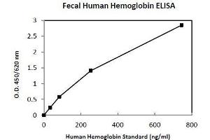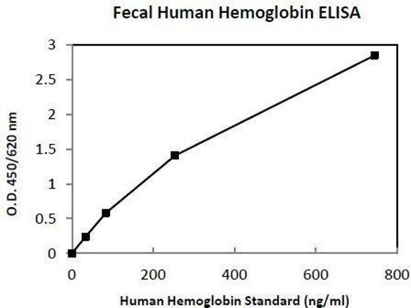 - This ELISA is designed, developed and produced for the quantitative measurement of human hemoglobin in stool sample. The assay utilizes the two-site sandwich technique with two selected antibodies that bind to different epitopes of human hemoglobin. Assay standards, controls and patient samples are added directly to wells of a microtiter plate that is coated with hemoglobin antibodies. Subsequently, a horseradish peroxidase (HRP)-conjugated human hemoglobin specific antibody is added to each well. After an incubation period, a sandwich of antibody human hemoglobin HRP-conjugated antibody is formed. The unbound antibody and buffer matrix is removed in the subsequent washing step. For the detection of this immunocomplex, the well is then incubated with a substrate solution in a timed reaction and then measured in a spectrophotometric microplate reader. The enzymatic activity of the immunocomplex bound to the wall of each microtiter well is directly proportional to the amount of human hemoglobin in a test sample. A standard curve is generated by plotting the absorbance versus the respective human hemoglobin concentration for each standard on point-to-point or 4 parameter curve fitting. The concentration of fecal human hemoglobin in test samples is determined directly from this standard curve.