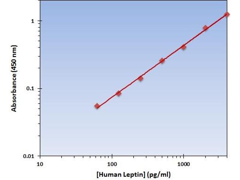- The OmniKine? Human Leptin ELISA Kit contains the components necessary for quantitative determination of natural or recombinant Human Leptin concentrations within any experimental sample including cell lysates, serum and plasma. This particular immunoassay utilizes the quantitative technique of a "Sandwich" Enzyme-Linked Immunosorbent Assay (ELISA) where the target protein (antigen) is bound in a "sandwich" format by the primary capture antibodies coated to each well-bottom and the secondary detection antibodies added subsequently by the investigator. The capture antibodies coated to the bottom of each well are specific for a particular epitope on Human Leptin while the user-added detection antibodies bind to epitopes on the captured target protein. Amid each step of the procedure, a series of wash steps must be performed to ensure the elimination of non- specific binding between proteins to other proteins or to the solid phase. After incubation and "sandwiching" of the target antigen, a peroxidase enzyme is conjugated to the constant heavy chain of the secondary antibody (either covalently or via Avidin/Streptavidin-Biotin interactions), allowing for a colorimetric reaction to ensue upon substrate addition. When the substrate TMB (3, 3', 5, 5'-Tetramethylbenzidine) is added, the reaction catalyzed by peroxidase yields a blue color that is representative of the antigen concentration. Upon sufficient color development, the reaction can be terminated through addition of Stop Solution (2 N Sulfuric Acid) where the color of the solution will turn yellow. The absorbance of each well can then be read by a spectrophotometer, allowing for generation of a standard curve and subsequent determination of protein concentration.