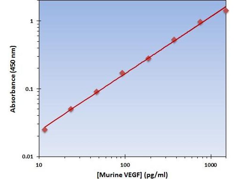 - The OmniKine? Murine VEGF ELISA Kit contains the components necessary for quantitative determination of natural or recombinant Murine VEGF concentrations within any experimental sample including cell lysates, serum and plasma. This particular immunoassay utilizes the quantitative technique of a "Sandwich" Enzyme-Linked Immunosorbent Assay (ELISA) where the target protein (antigen) is bound in a "sandwich" format by the primary capture antibodies coated to each well-bottom and the secondary detection antibodies added subsequently by the investigator. The capture antibodies coated to the bottom of each well are specific for a particular epitope on Murine VEGF while the user-added detection antibodies bind to epitopes on the captured target protein. Amid each step of the procedure, a series of wash steps must be performed to ensure the elimination of non- specific binding between proteins to other proteins or to the solid phase. After incubation and "sandwiching" of the target antigen, a peroxidase enzyme is conjugated to the constant heavy chain of the secondary antibody (either covalently or via Avidin/Streptavidin-Biotin interactions), allowing for a colorimetric reaction to ensue upon substrate addition. When the substrate TMB (3, 3', 5, 5'-Tetramethylbenzidine) is added, the reaction catalyzed by peroxidase yields a blue color that is representative of the antigen concentration. Upon sufficient color development, the reaction can be terminated through addition of Stop Solution (2 N Sulfuric Acid) where the color of the solution will turn yellow. The absorbance of each well can then be read by a spectrophotometer, allowing for generation of a standard curve and subsequent determination of protein concentration.