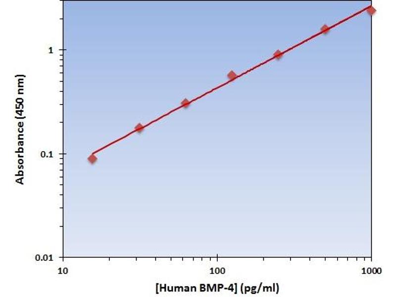 - The OmniKine? Human BMP-4 ELISA Kit contains the components necessary for quantitative determination of natural or recombinant Human BMP-4 concentrations within any experimental sample including cell lysates, serum and plasma. This particular immunoassay utilizes the quantitative technique of a "Sandwich" Enzyme-Linked Immunosorbent Assay (ELISA) where the target protein (antigen) is bound in a "sandwich" format by the primary capture antibodies coated to each well-bottom and the secondary detection antibodies added subsequently by the investigator. The capture antibodies coated to the bottom of each well are specific for a particular epitope on Human BMP-4 while the user-added detection antibodies bind to epitopes on the captured target protein. Amid each step of the procedure, a series of wash steps must be performed to ensure the elimination of non-specific binding between proteins to other proteins or to the solid phase. After incubation and "sandwiching" of the target antigen, a peroxidase enzyme is conjugated to the constant heavy chain of the secondary antibody (either covalently or via Avidin/Streptavidin-Biotin interactions), allowing for a colorimetric reaction to ensue upon substrate addition. When the substrate TMB (3, 3', 5, 5'-Tetramethylbenzidine) is added, the reaction catalyzed by peroxidase yields a blue color that is representative of the antigen concentration. Upon sufficient color development, the reaction can be terminated through addition of Stop Solution (2 N Sulfuric Acid) where the color of the solution will turn yellow. The absorbance of each well can then be read by a spectrophotometer, allowing for generation of a standard curve and subsequent determination of protein concentration.
