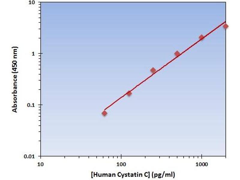 - The OmniKine? Human Cystatin C ELISA Kit contains the components necessary for quantitative determination of natural or recombinant Human Cystatin C concentrations within any experimental sample including cell lysates, serum and plasma. This particular immunoassay utilizes the quantitative technique of a "Sandwich" Enzyme- Linked Immunosorbent Assay (ELISA) where the target protein (antigen) is bound in a "sandwich" format by the primary capture antibodies coated to each well-bottom and the secondary detection antibodies added subsequently by the investigator. The capture antibodies coated to the bottom of each well are specific for a particular epitope on Human Cystatin C while the user-added detection antibodies bind to epitopes on the captured target protein. Amid each step of the procedure, a series of wash steps must be performed to ensure the elimination of non-specific binding between proteins to other proteins or to the solid phase. After incubation and "sandwiching" of the target antigen, a peroxidase enzyme is conjugated to the constant heavy chain of the secondary antibody (either covalently or via Avidin/Streptavidin-Biotin interactions), allowing for a colorimetric reaction to ensue upon substrate addition. When the substrate TMB (3, 3', 5, 5'-Tetramethylbenzidine) is added, the reaction catalyzed by peroxidase yields a blue color that is representative of the antigen concentration. Upon sufficient color development, the reaction can be terminated through addition of Stop Solution (2 N Sulfuric Acid) where the color of the solution will turn yellow. The absorbance of each well can then be read by a spectrophotometer, allowing for generation of a standard curve and subsequent determination of protein concentration.