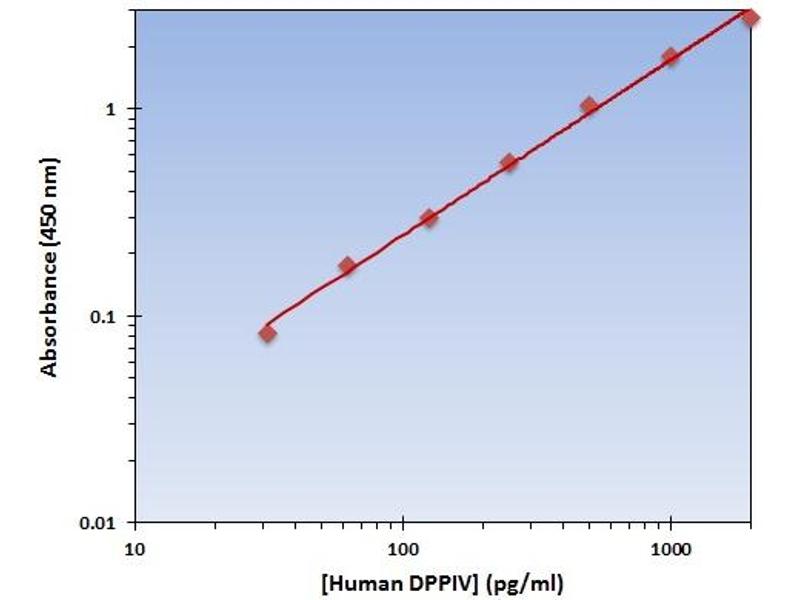 - The OmniKine? Human DPPIV ELISA Kit contains the components necessary for quantitative determination of natural or recombinant Human DPPIV concentrations within any experimental sample including cell lysates, serum and plasma. This particular immunoassay utilizes the quantitative technique of a "Sandwich" Enzyme-Linked Immunosorbent Assay (ELISA) where the target protein (antigen) is bound in a "sandwich" format by the primary capture antibodies coated to each well-bottom and the secondary detection antibodies added subsequently by the investigator. The capture antibodies coated to the bottom of each well are specific for a particular epitope on Human DPPIV while the user-added detection antibodies bind to epitopes on the captured target protein. Amid each step of the procedure, a series of wash steps must be performed to ensure the elimination of non- specific binding between proteins to other proteins or to the solid phase. After incubation and "sandwiching" of the target antigen, a peroxidase enzyme is conjugated to the constant heavy chain of the secondary antibody (either covalently or via Avidin/Streptavidin-Biotin interactions), allowing for a colorimetric reaction to ensue upon substrate addition. When the substrate TMB (3, 3', 5, 5'-Tetramethylbenzidine) is added, the reaction catalyzed by peroxidase yields a blue color that is representative of the antigen concentration. Upon sufficient color development, the reaction can be terminated through addition of Stop Solution (2 N Sulfuric Acid) where the color of the solution will turn yellow. The absorbance of each well can then be read by a spectrophotometer, allowing for generation of a standard curve and subsequent determination of protein concentration.