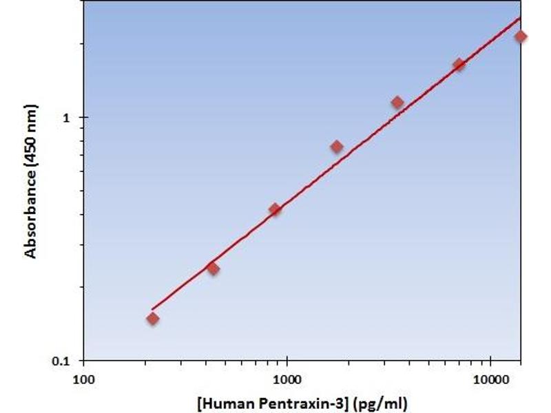 - The OmniKine? Human Pentraxin-3 ELISA Kit contains the components necessary for quantitative determination of natural or recombinant Human Pentraxin-3 concentrations within any experimental sample including cell lysates, serum and plasma. This particular immunoassay utilizes the quantitative technique of a "Sandwich" Enzyme- Linked Immunosorbent Assay (ELISA) where the target protein (antigen) is bound in a "sandwich" format by the primary capture antibodies coated to each well-bottom and the secondary detection antibodies added subsequently by the investigator. The capture antibodies coated to the bottom of each well are specific for a particular epitope on Human Pentraxin-3 while the user-added detection antibodies bind to epitopes on the captured target protein. Amid each step of the procedure, a series of wash steps must be performed to ensure the elimination of non-specific binding between proteins to other proteins or to the solid phase. After incubation and "sandwiching" of the target antigen, a peroxidase enzyme is conjugated to the constant heavy chain of the secondary antibody (either covalently or via Avidin/Streptavidin-Biotin interactions), allowing for a colorimetric reaction to ensue upon substrate addition. When the substrate TMB (3, 3', 5, 5'-Tetramethylbenzidine) is added, the reaction catalyzed by peroxidase yields a blue color that is representative of the antigen concentration. Upon sufficient color development, the reaction can be terminated through addition of Stop Solution (2 N Sulfuric Acid) where the color of the solution will turn yellow. The absorbance of each well can then be read by a spectrophotometer, allowing for generation of a standard curve and subsequent determination of protein concentration.