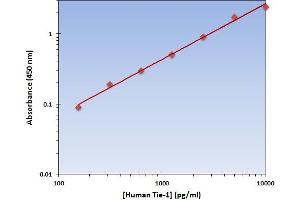 - The Human Tie-1 ELISA Kit allows for the detection and quantification of endogenous levels of natural and/or recombinant Human Tie-1 proteins within the range of 157-10000 pg/mL.