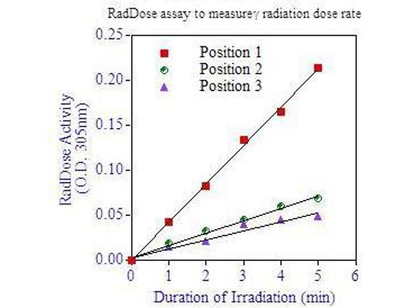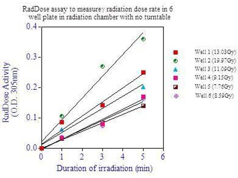 RadChemDosi™ Cell Survival Assay Kit contains enough reagents for 100 test if 1 ml is used for irradiation. RadChemDosi™ is sensitive to measure the dose rate as low as 2.5Gy/min at various positions in a Cesium irradiator chamber. In addition to calibrating the dose rate at each position in a radiation chamber periodically, it can also be used to measure the dose rate in each well of a 6 and 24 wells plate.