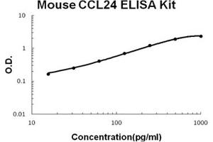 - mouse CCL24 ELISA Kit was based on standard sandwich enzyme-linked immune-sorbent assay technology. A monoclonal antibody from rat specific for CCL24 has been precoated onto 96-well plates. Standards(E.coli, V27-V119) and test samples are added to the wells, a biotinylated detection polyclonal antibody from goat specific for CCL24 is added subsequently and then followed by washing with PBS or TBS buffer. Avidin-Biotin-Peroxidase Complex was added and unbound conjugates were washed away with PBS or TBS buffer. HRP substrate TMB was used to visualize HRP enzymatic reaction. TMB was catalyzed by HRP to produce a blue color product that changed into yellow after adding acidic stop solution. The density of yellow is proportional to the mouse CCL24 amount of sample captured in plate.