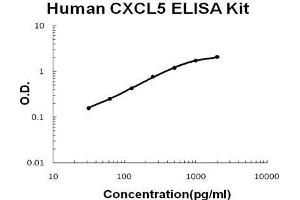 - human CXCL5 ELISA Kit was based on standard sandwich enzyme-linked immune-sorbent assay technology. A monoclonal antibody from mouse specific for CXCL5 has been precoated onto 96-well plates. Standards(E.coli, A37-N114) and test samples are added to the wells, a biotinylated detection polyclonal antibody from goat specific for CXCL5 is added subsequently and then followed by washing with PBS or TBS buffer. Avidin-Biotin-Peroxidase Complex was added and unbound conjugates were washed away with PBS or TBS buffer. HRP substrate TMB was used to visualize HRP enzymatic reaction. TMB was catalyzed by HRP to produce a blue color product that changed into yellow after adding acidic stop solution. The density of yellow is proportional to the human CXCL5 amount of sample captured in plate.